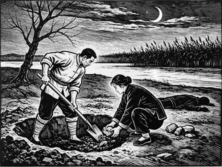 此时,月亮还没上来,四周黑得伸手不见五指。徐大根夫妇摸黑找到了那鬼子兵的尸体,此时,这尸身已经冰凉了。俩人拖着尸首,在河滩上找了个低洼处,用硬树枝挖了个坑。土很硬,俩人挖了半天,手脚并用,手上都磨出了血泡。
