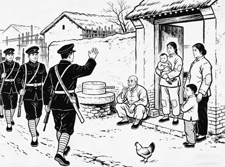 徐大嫂来不及多想,跟着男人往后门跑。可刚跑出院子,就看见一队鬼子已经进了庄口,正挨家挨户踹门。